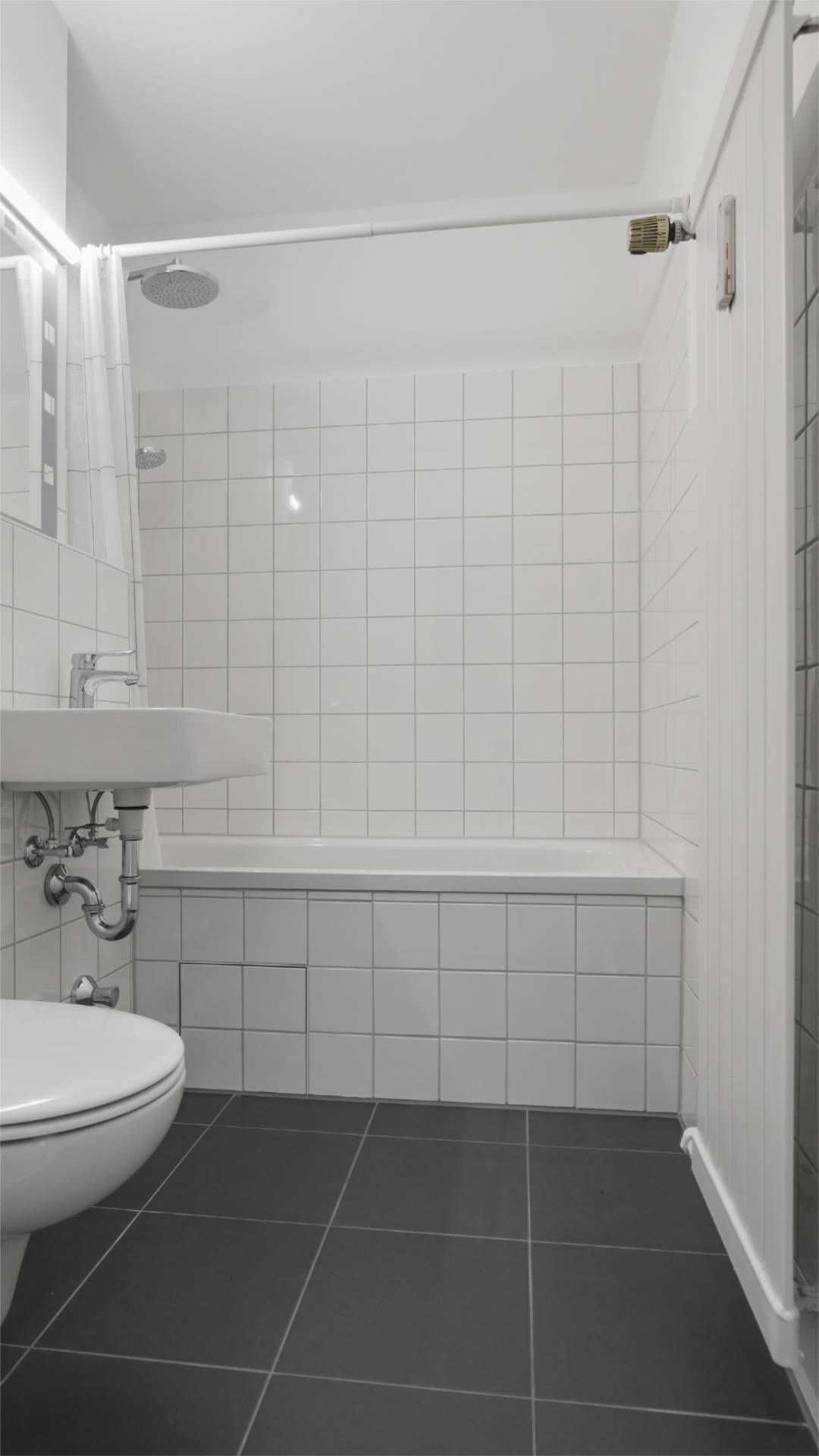 - Das elegante Badezimmer ist mit einer Badewanne, einem Waschbecken und einer Toilette ausgestattet. Das ansprechende Design und die hochwertigen Materialien laden zum Entspannen ein. Die zusätzliche Regendusche in der Wanne sorgt für ein erholsames Duscherlebnis und steigert den Komfort in diesem stilvollen Badezimmer.