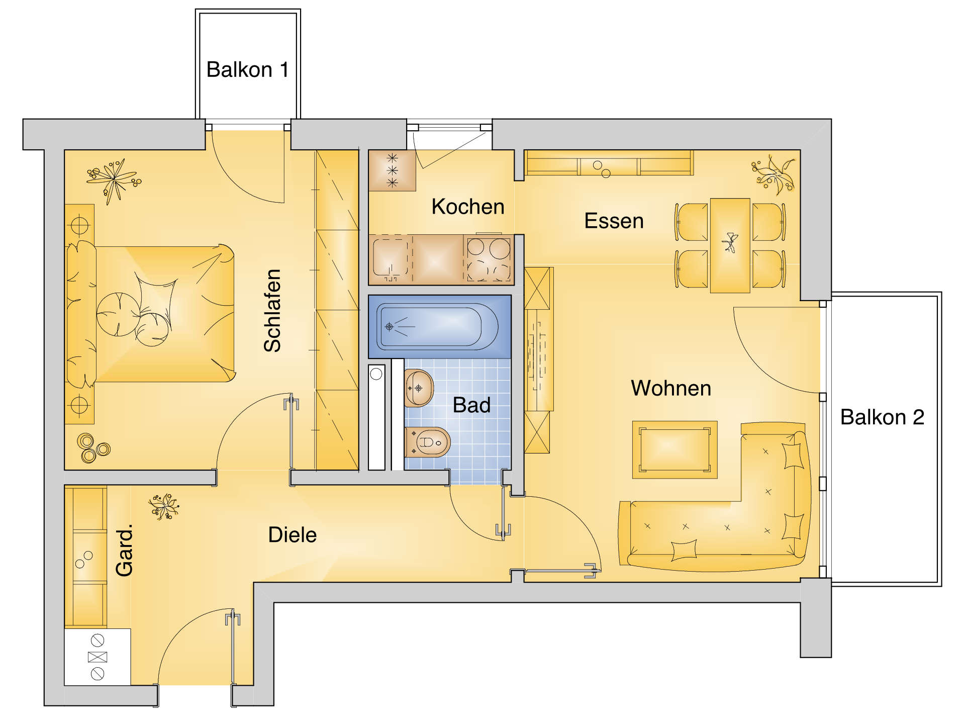 - Ein großzügiges Wohnzimmer mit Zugang zum südausgerichteten Balkon, der zum Entspannen und Sonnenbaden einlädt.