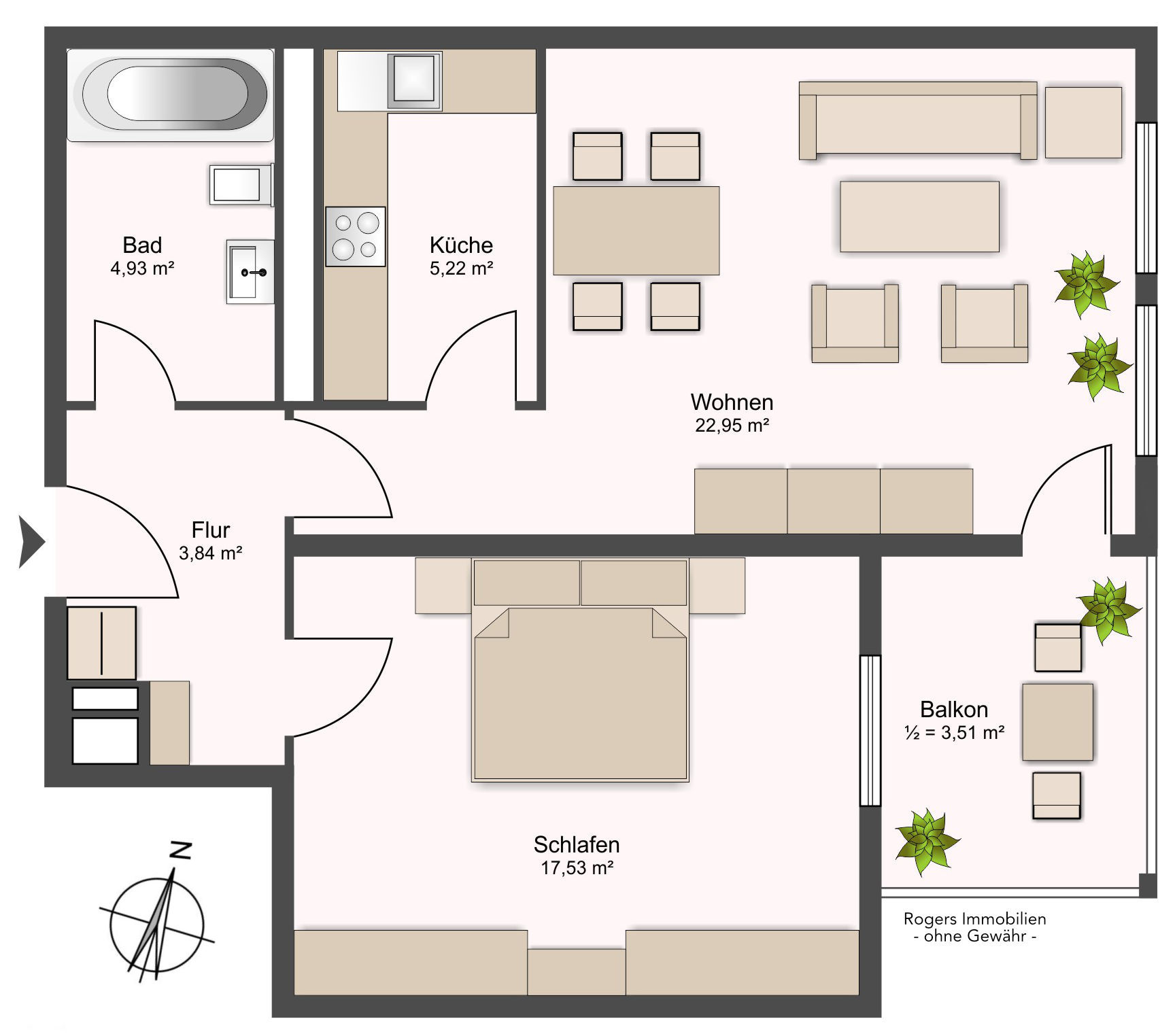 Die Gesamtwohnfläche beträgt ca. 58,98 m² und ist wie folgt aufgeteilt: