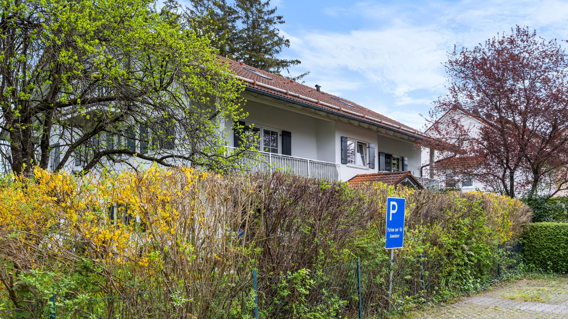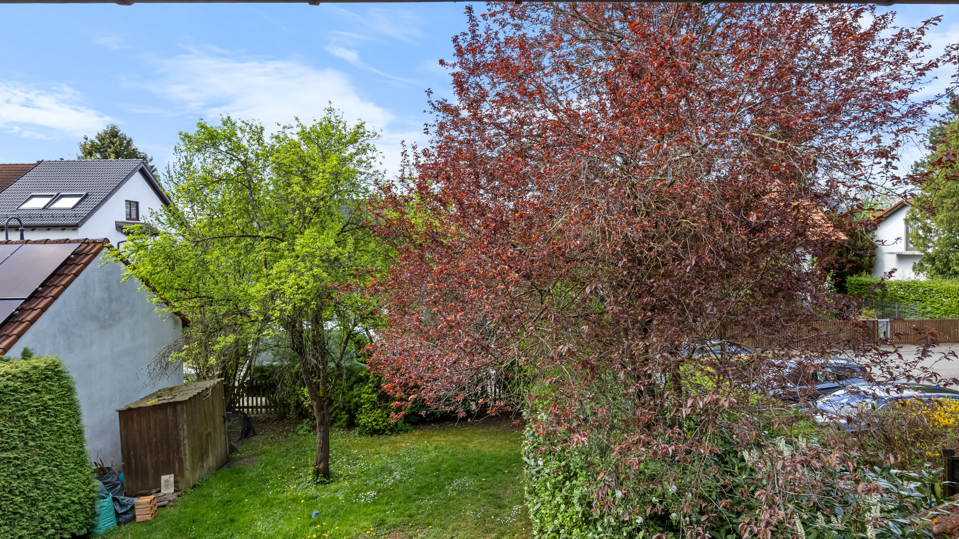Vom Wohnzimmer und auch von den anderen Zimmern genießen Sie einen schönen Ausblick auf das grüne Umfeld und die umliegende Bebauung – mit ausreichend Abstand zu den Nachbarn für Privatsphäre und ungestörtes Wohnen.