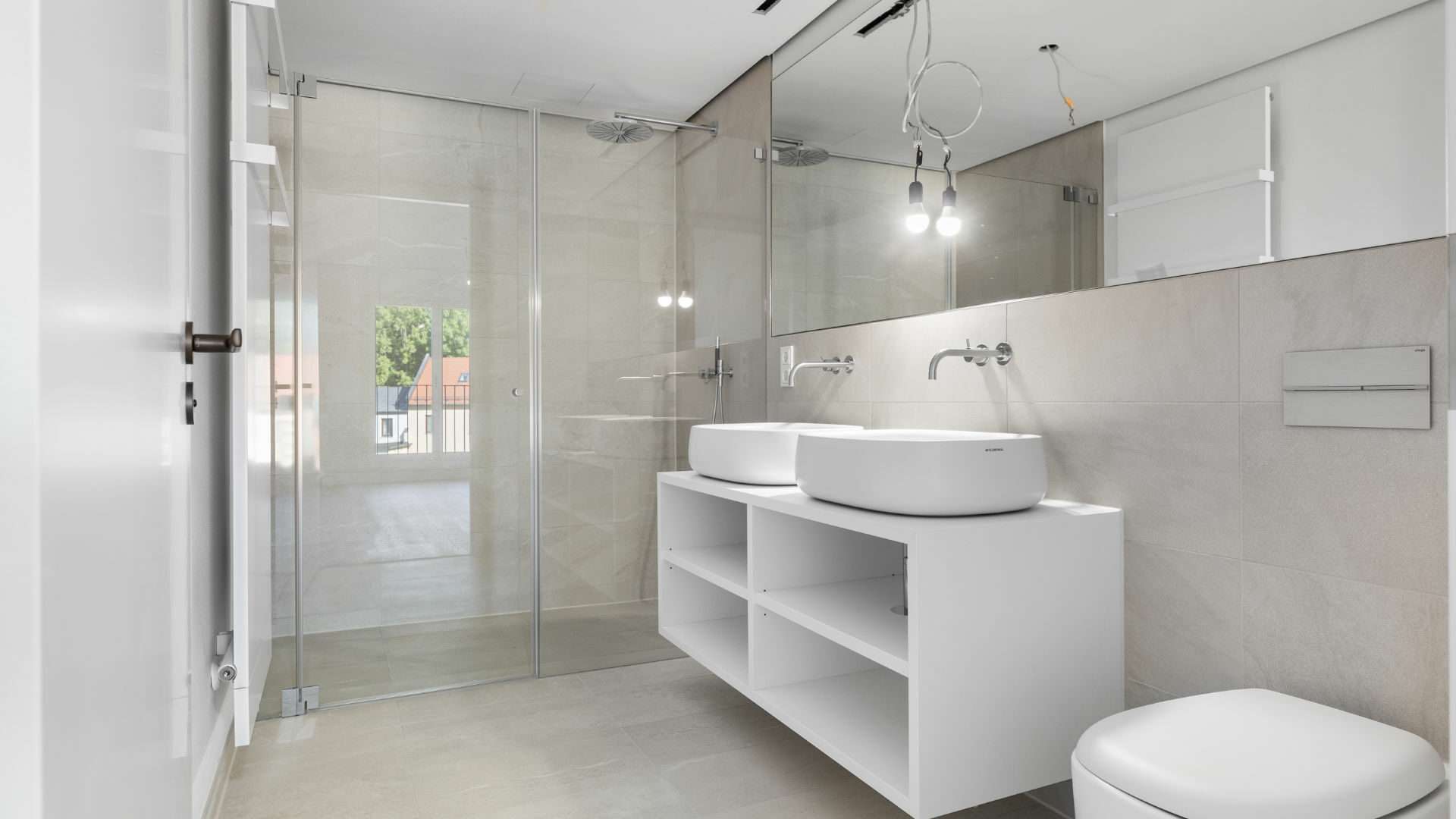 - Zwei hochwertige Badezimmer mit stilvoller Sanitärausstattung namhafter Hersteller: Beide Bäder zeichnen sich durch hochwertige Wand- und Bodenfliesen und Sanitärausstattung von renommierten Markenherstellern aus. Sie können sich über zwei Duschbäder freuen. Beide Bäder verfügen zusätzlich jeweils über ein bzw. zwei Waschtische mit Waschbecken und jeweils eine Toilette. In dem größeren Bad stehen Ihnen zwei edle Handtuchheizkörper und in dem kleineren Bad ein Handtuchheizkörper zur Verfügung.