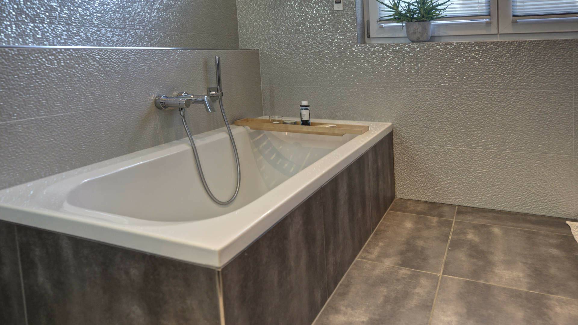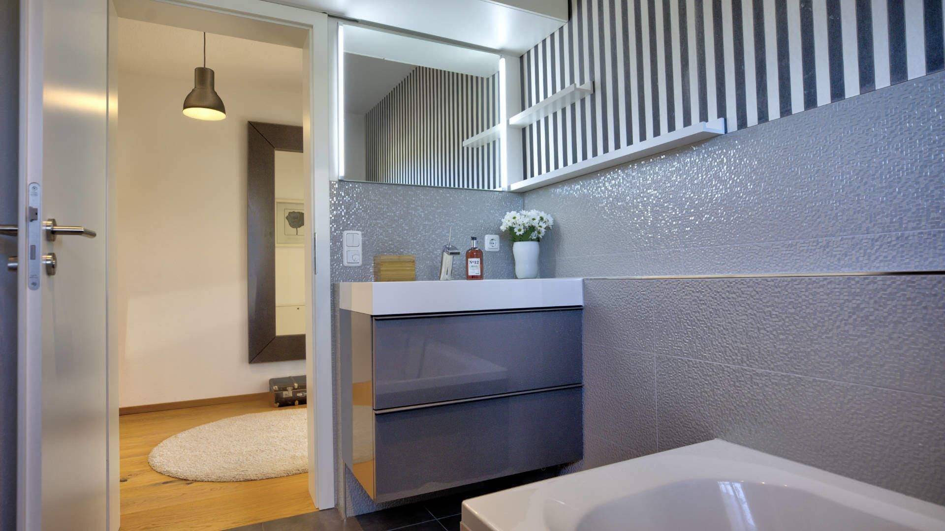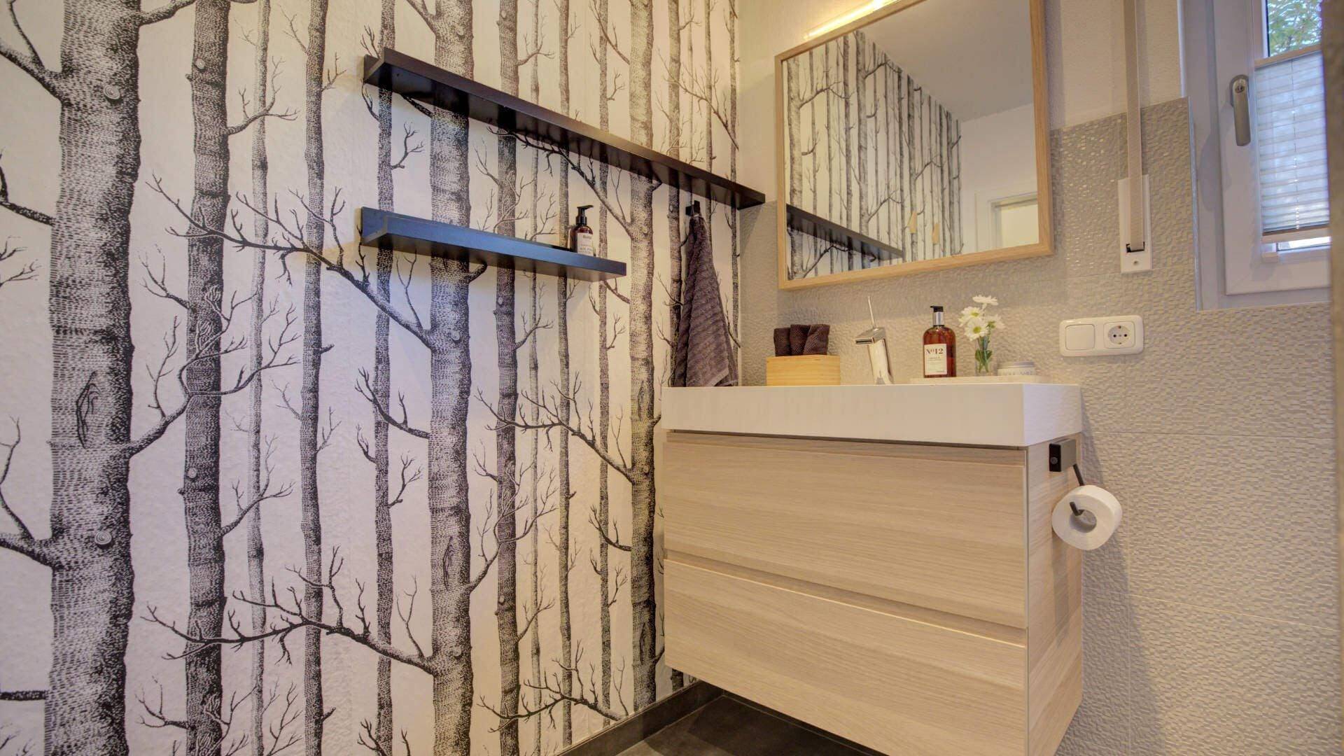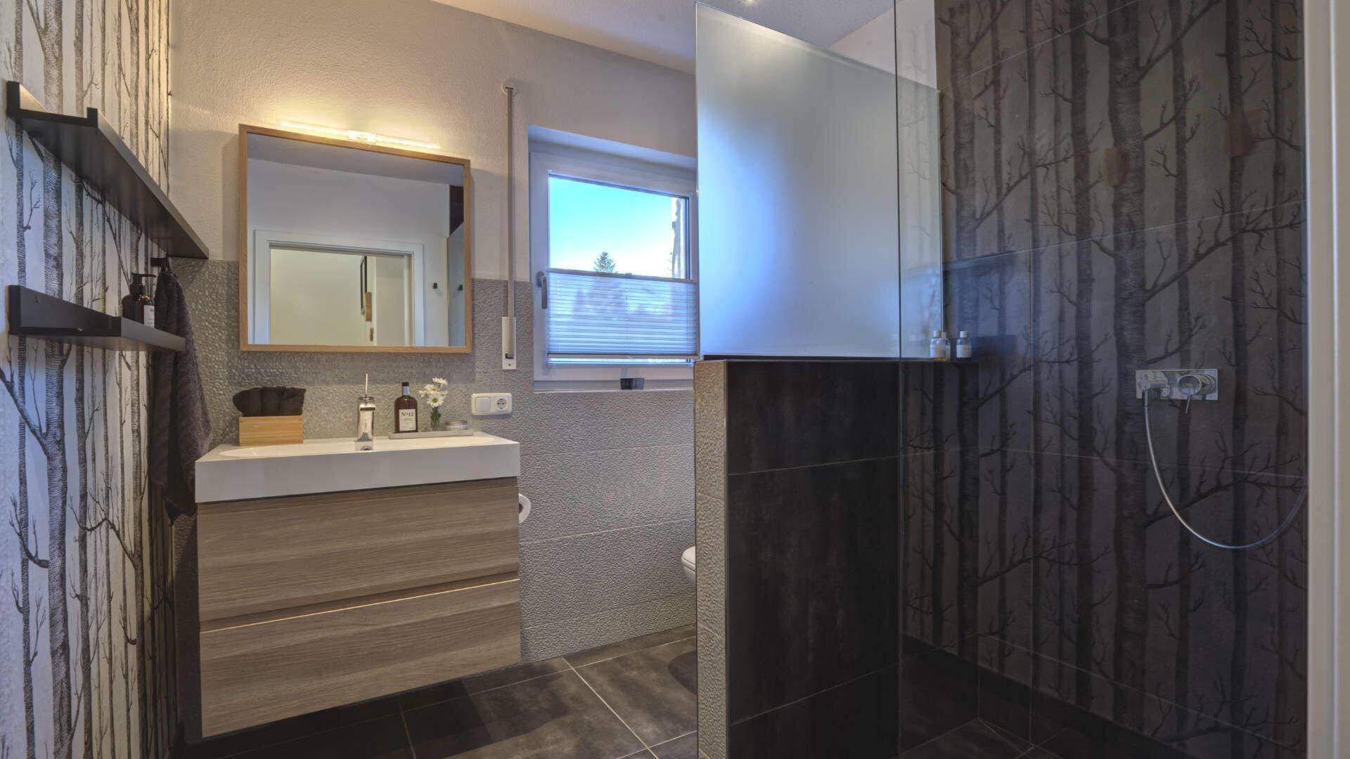 - Zwei edle Badezimmer mit Fenster: Das Fenster im Obergeschoss ist mit Wanne, Waschbecken mit Unterwaschtisch, Dusche und Toilette ausgestattet. Das Bad im Erdgeschoss ist mit Dusche, Waschbecken mit Unterwaschtisch und Toilette ausgestattet. Des Weiteren verfügt das Duschbad im Erdgeschoss über eine breite Schiebetüre. Beide Bäder zeichnen sich durch zeitlosen Design aus.
