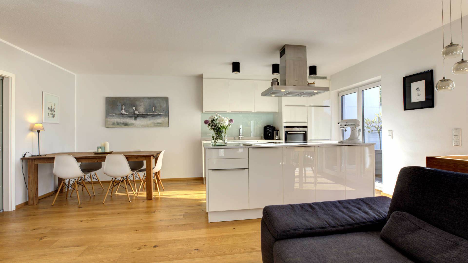 Die Terrasse mit dem Garten können Sie vom Wohnzimmer aus betreten. Durch die großen bodentiefen Fenster verschmilzt die Wohnung mit der grünen Umgebung. Die Wohnung hat außerdem einen eigenen Hauswirtschaftsraum mit Waschmaschinen- und Trockneranschluss, einen eigenen Kellerraum sowie eine eigene Heizung. Zu der Wohnung gehört ein unterer Stellplatz der Parklift-Doppelgarage mit elektrischer Torsteuerung und Funkfernbedienung.
