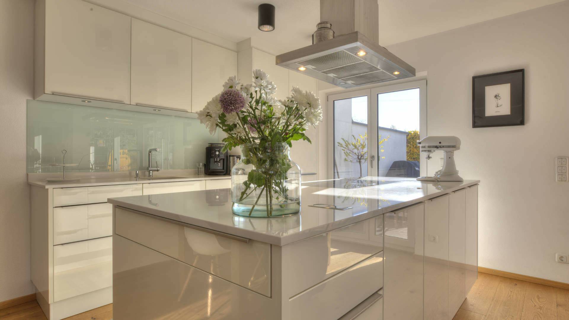 - Zeitlose Einbauküche in hochwertiger Ausführung mit einer Kochinsel. Die Einbauküche ist mit Cerankochfeld, Backofen, Geschirrspülmaschine und Kühlschrank ausgestattet.