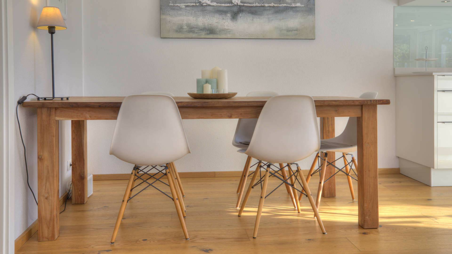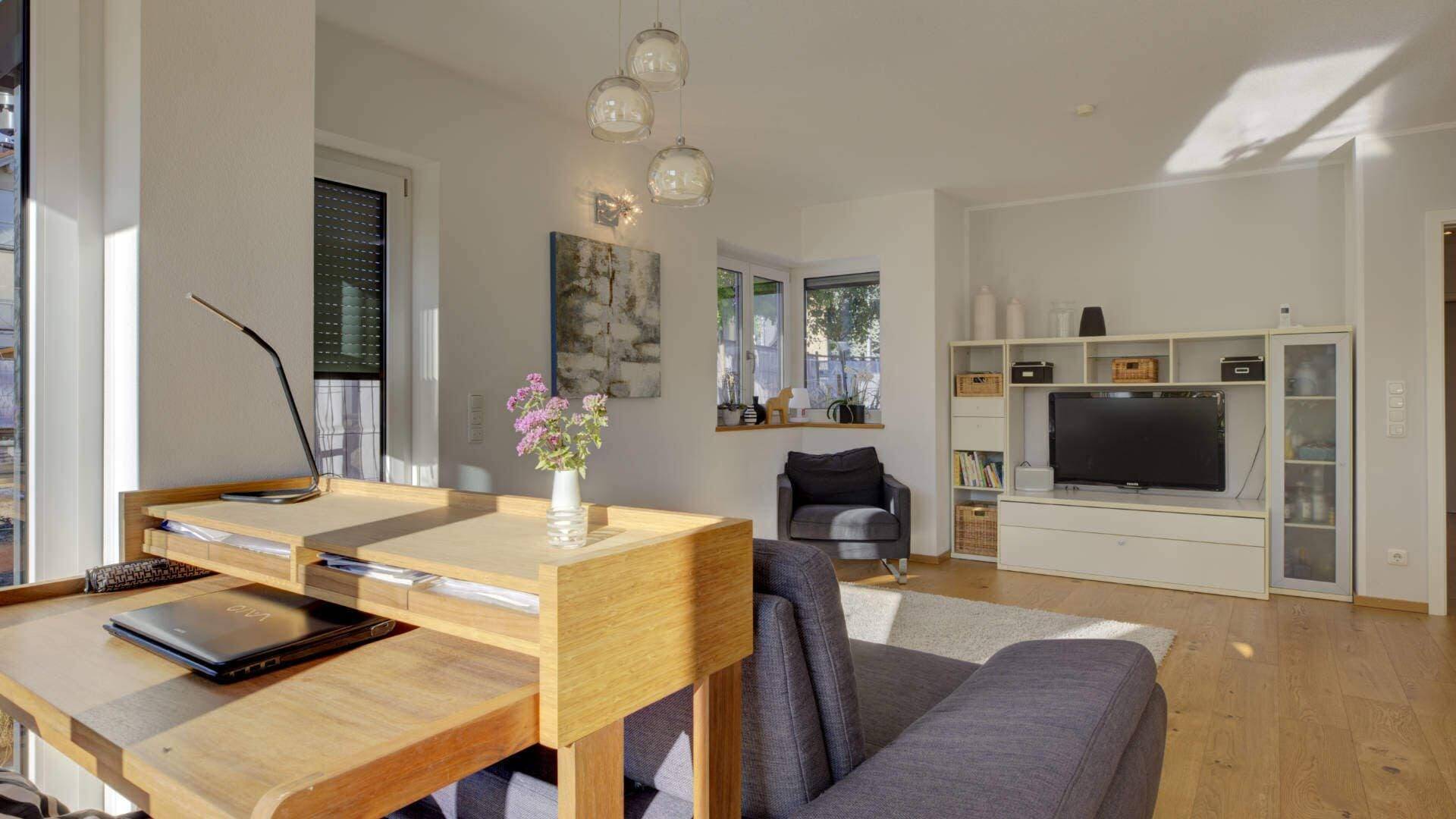 - Edler Parkettboden im Wohnzimmer, offene Küche und ein Schlafzimmer. Sehr hochwertiger Laminatboden in zwei Schlafzimmern und im Hobbyraum in Eichenoptik.