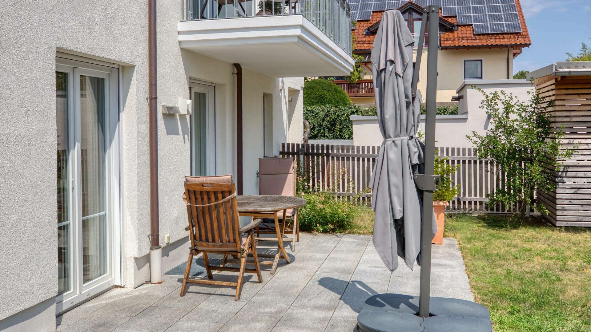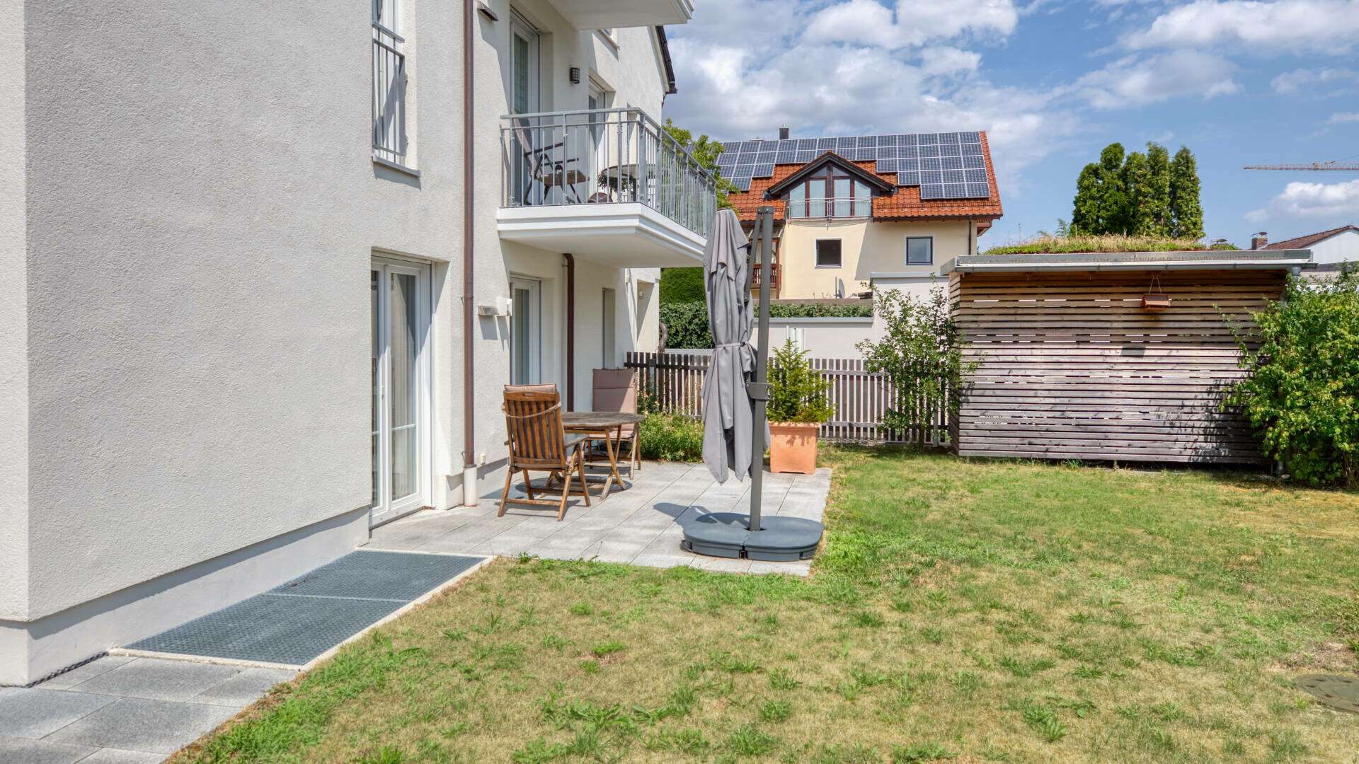 Der gepflegte Garten erstreckt sich über etwa 175 m² und bildet mit den zum Süden und Westen ausgerichteten Terrassen ein idyllisches Outdoor-Wohnerlebnis. Der Garten ist eingezäunt und steht Ihnen zur alleinigen Nutzung zur Verfügung. Bodentiefe Fenster schaffen eine luftige Atmosphäre und lassen die Sonnenstrahlen ein- und ausziehen, während Sie den herrlichen Blick ins Grüne genießen und Entspannung finden.