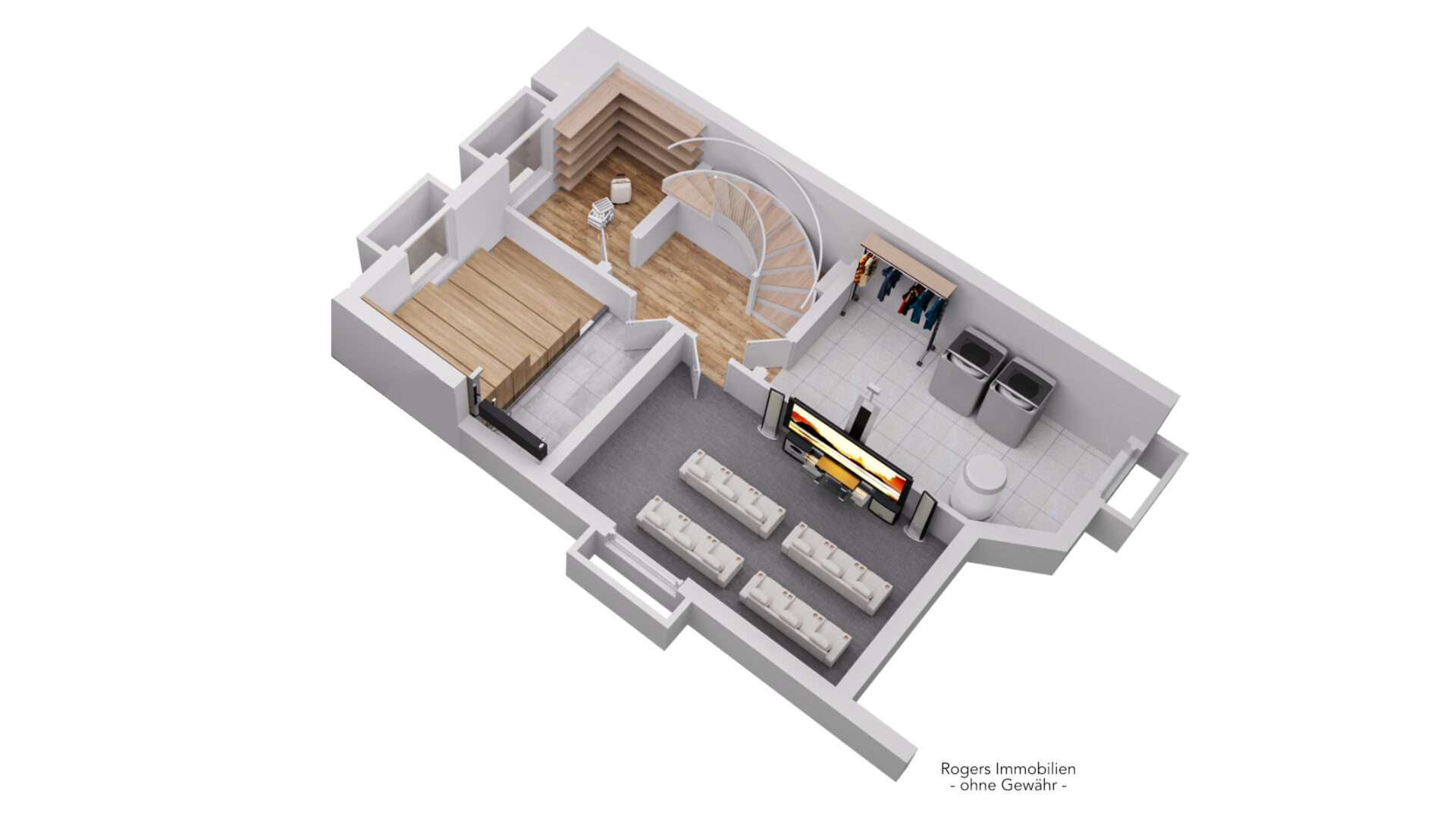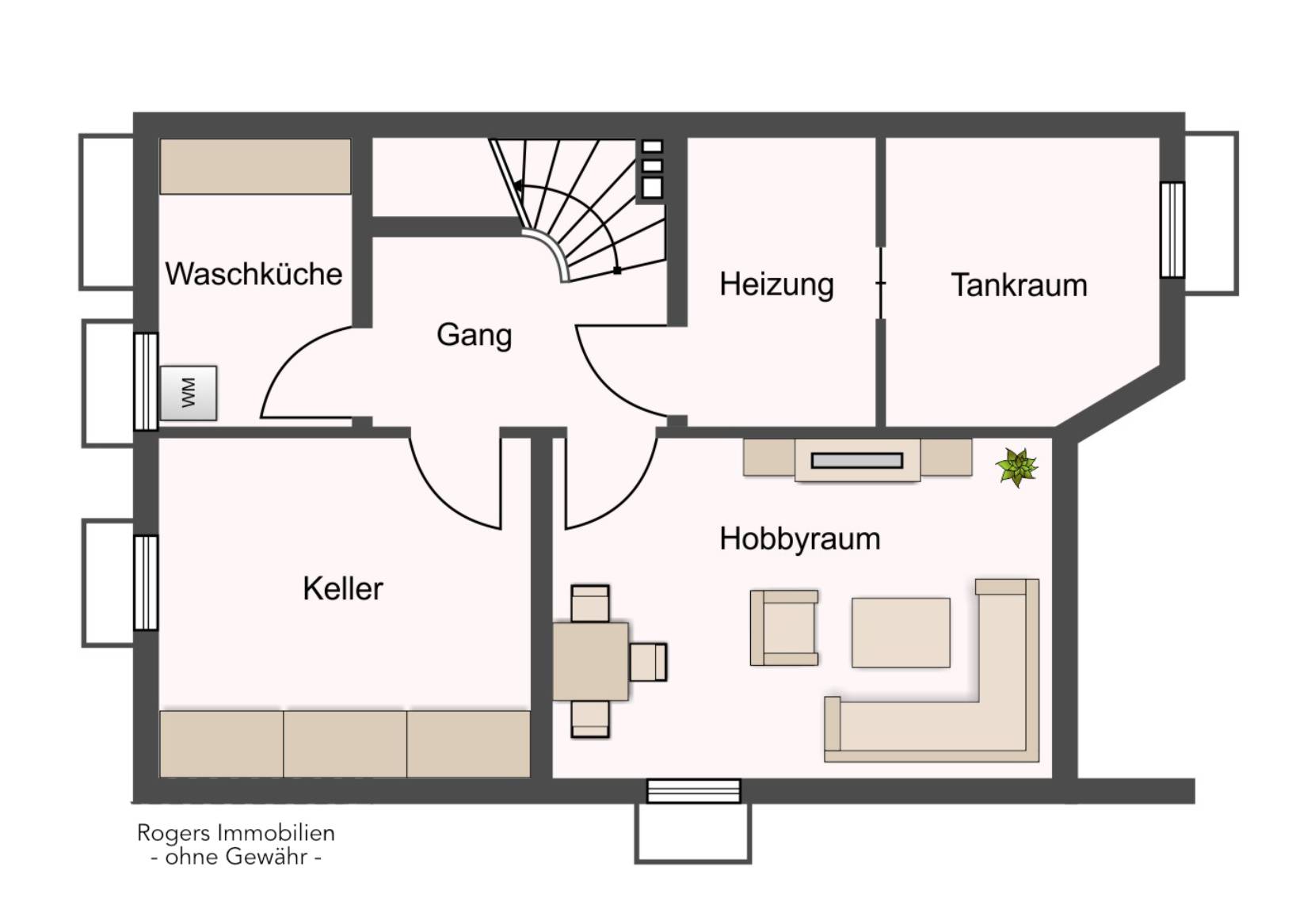 Das Haus ist voll unterkellert. Das Untergeschoss ist in einen Hobbyraum, einen Heizraum und eine Waschküche sowie einen Abstellraum aufgeteilt.