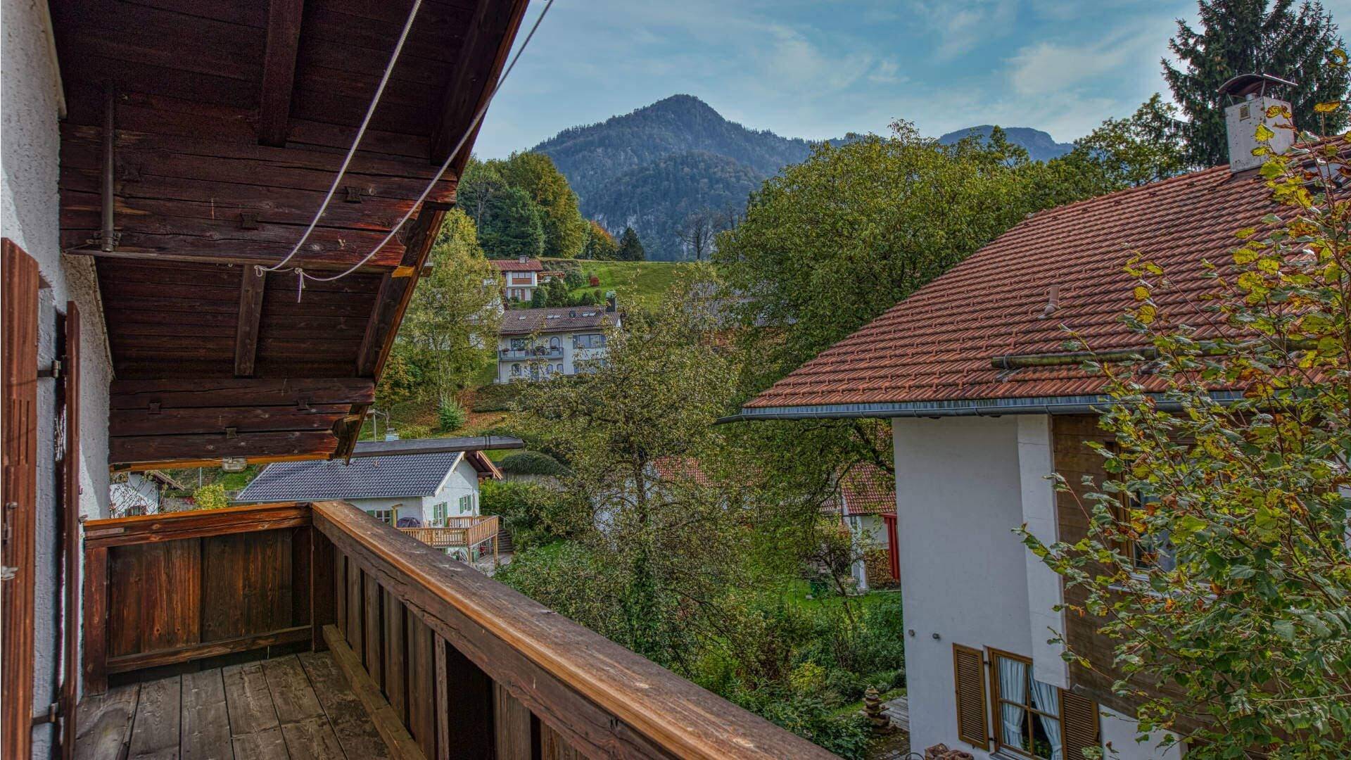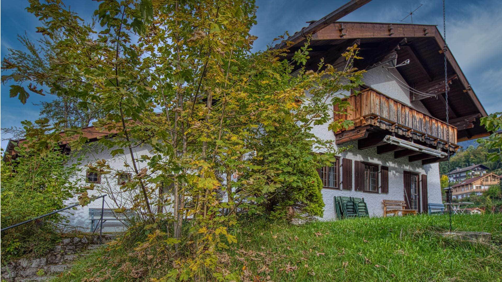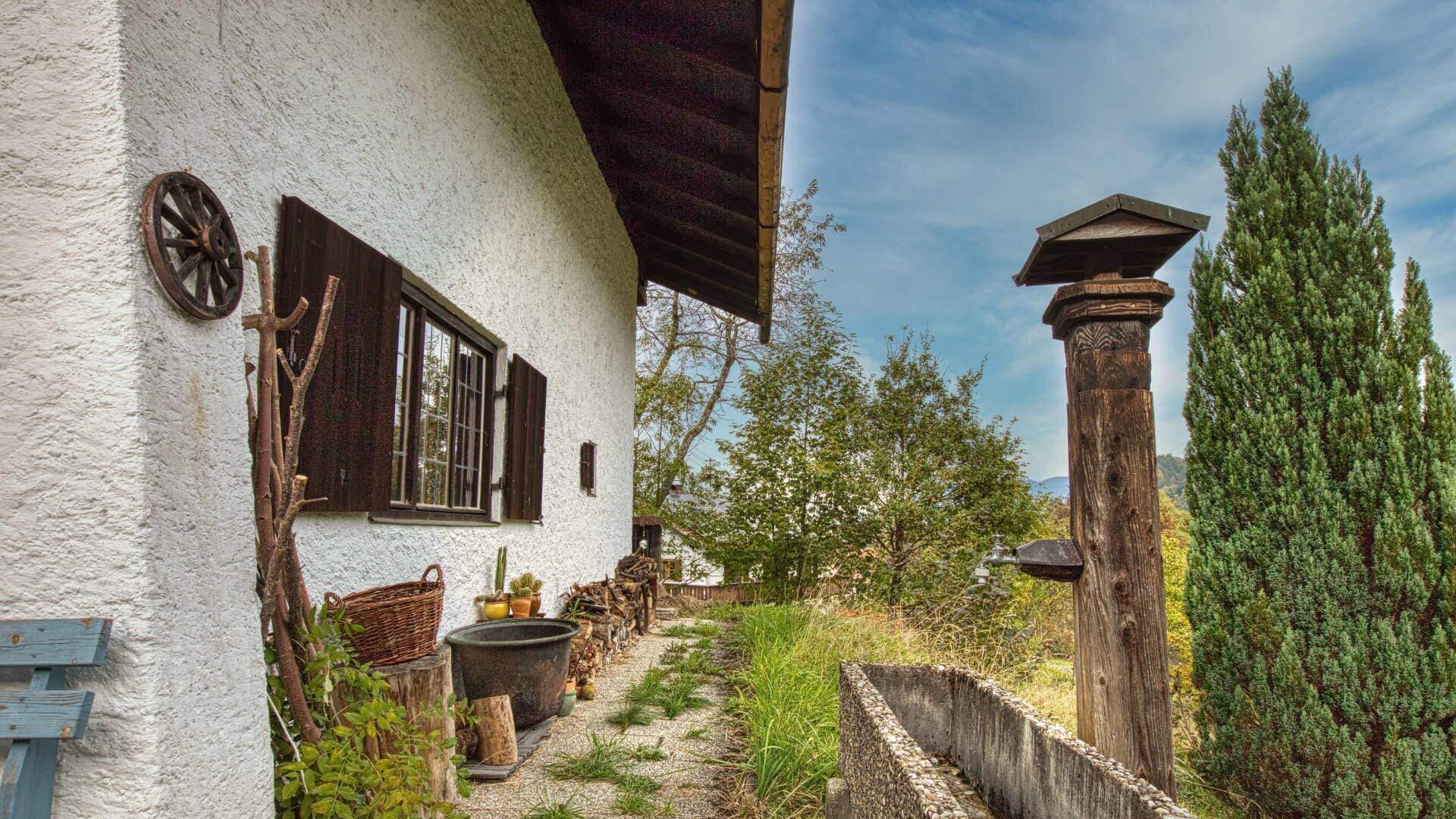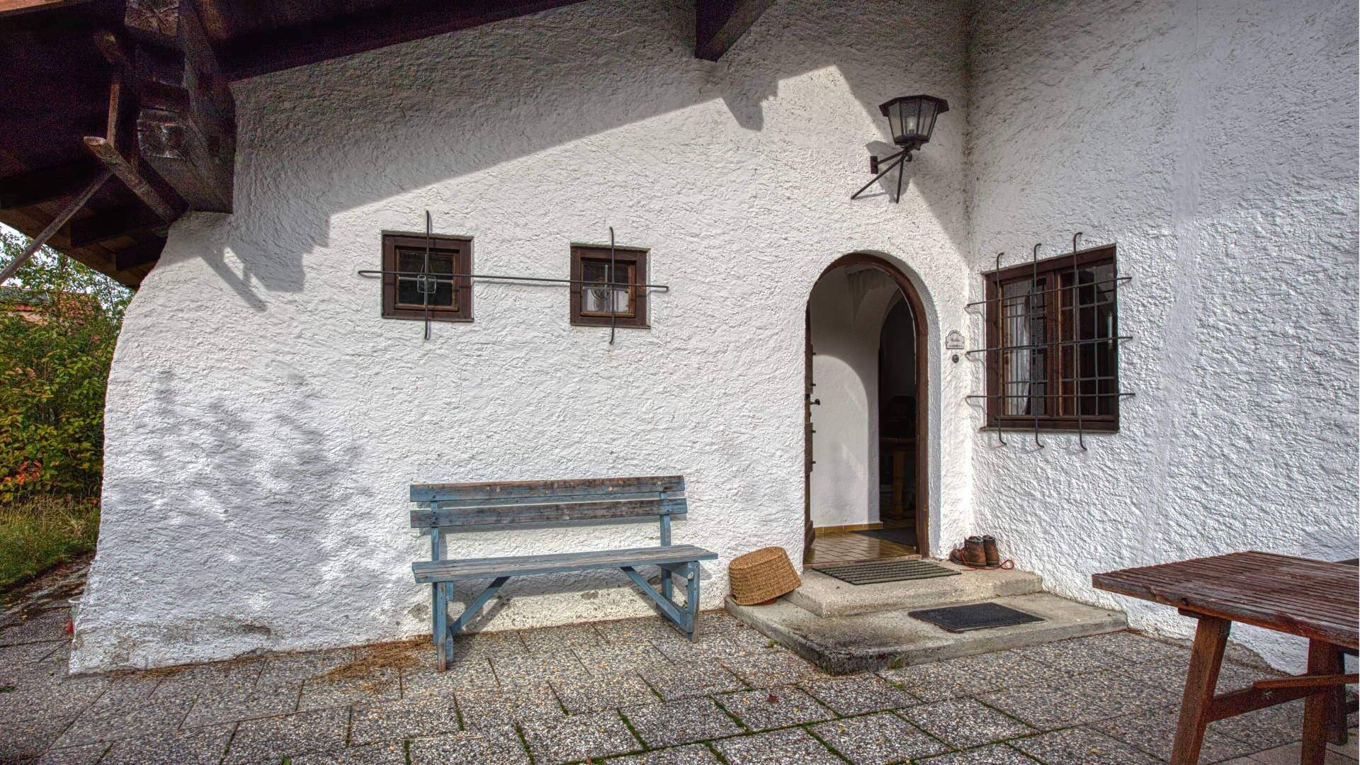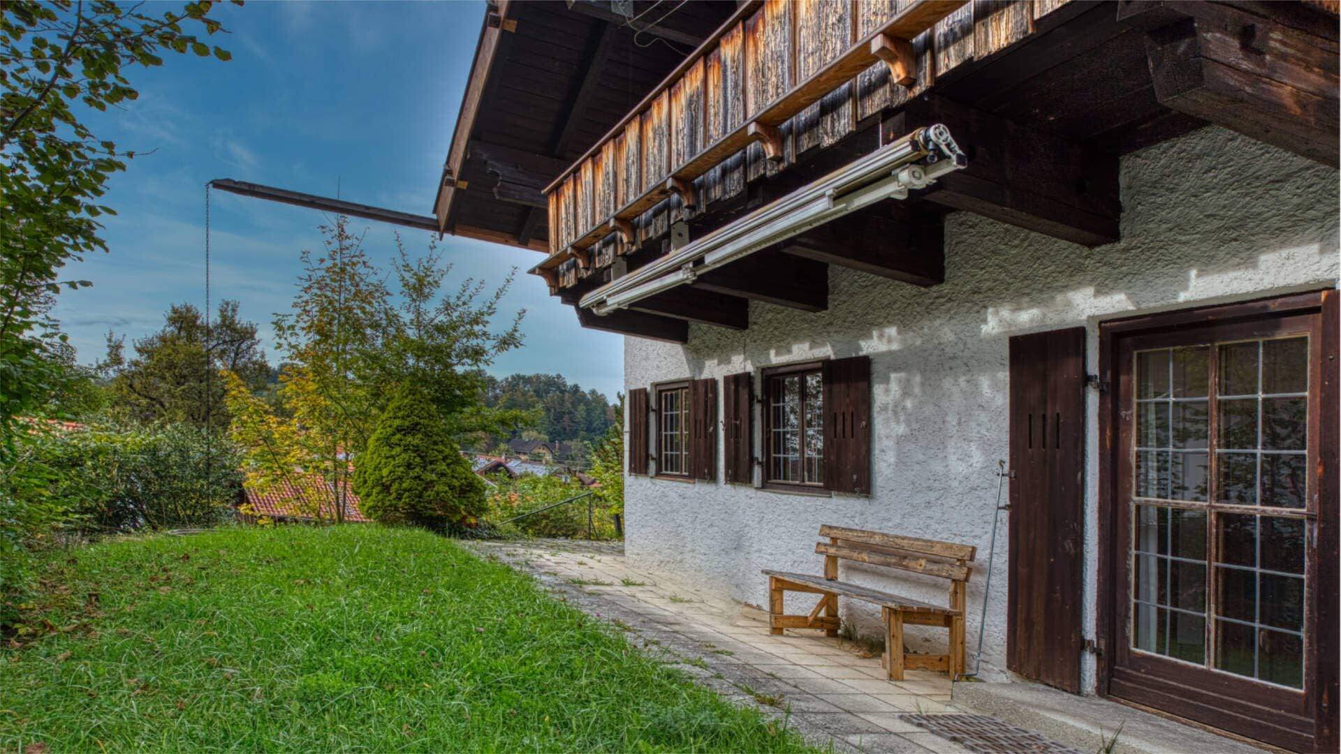 Das Grundstück liegt in einer kleinen und ruhigen Anliegerstraße in Kochel am See. Nur ein paar Vögel zwitschern, ein Rauschen der Blätter in den Bäumen, sonst ist es ruhiger. Das Haus liegt auf einer Anhöhe und ist über eine Treppe erreichbar.