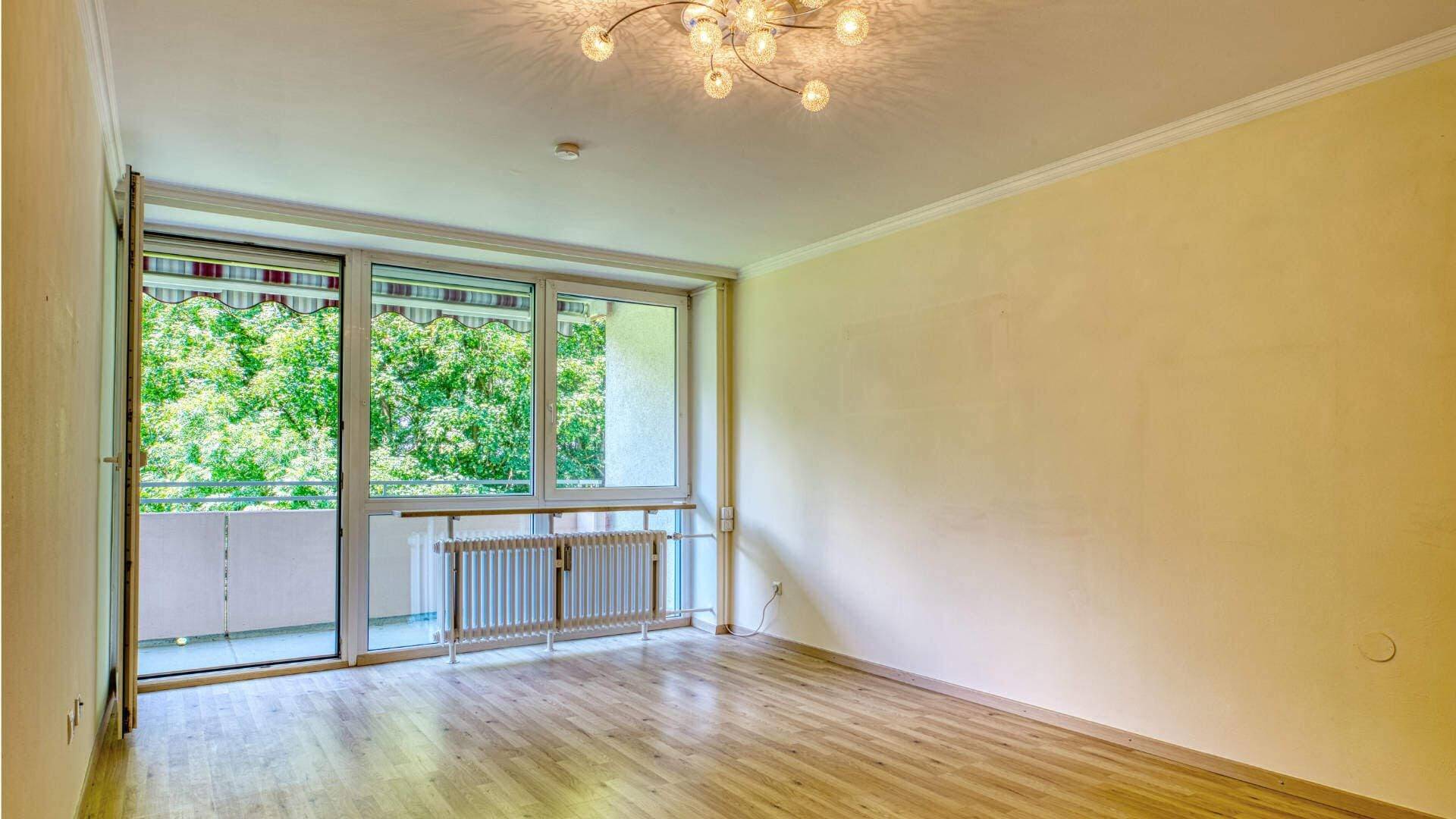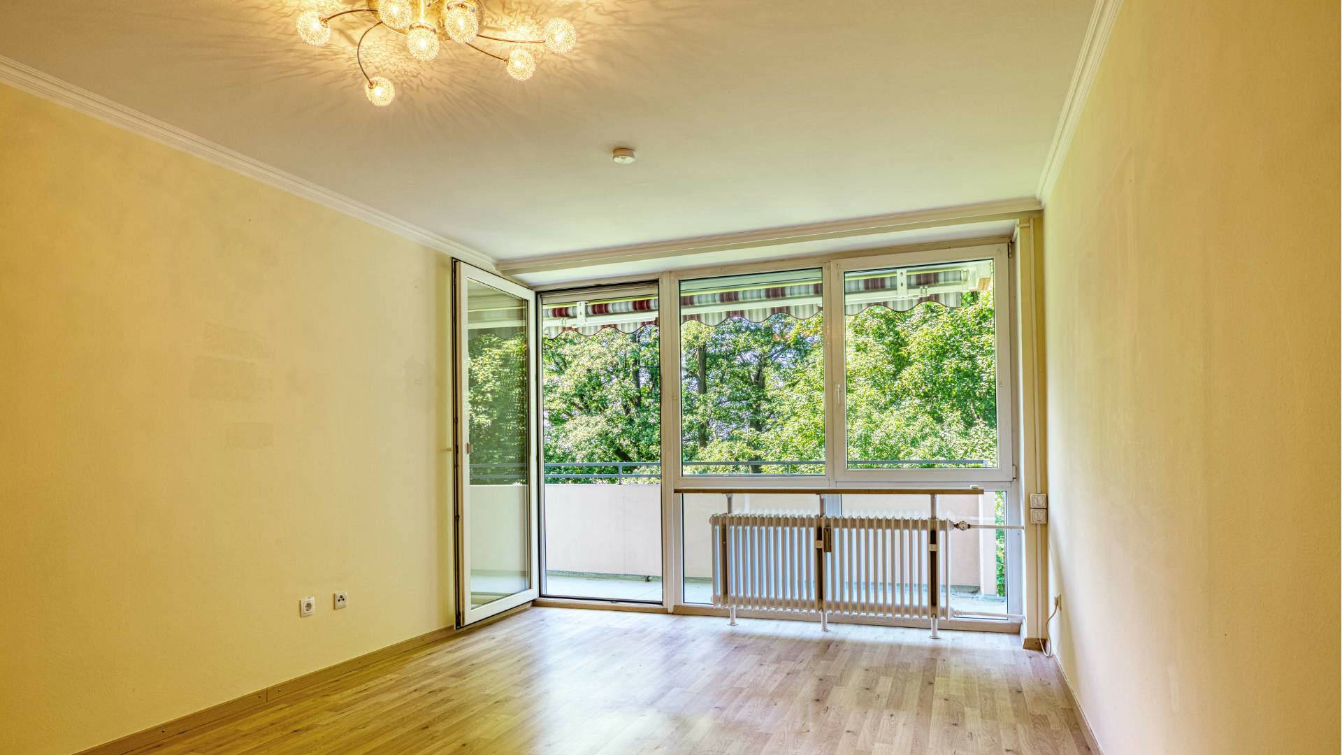 • Sehr großzügiges Wohnzimmer mit Zugang zum großen Westbalkon und freien Blick ins Grüne. Der Balkon ist uneinsehbar!
