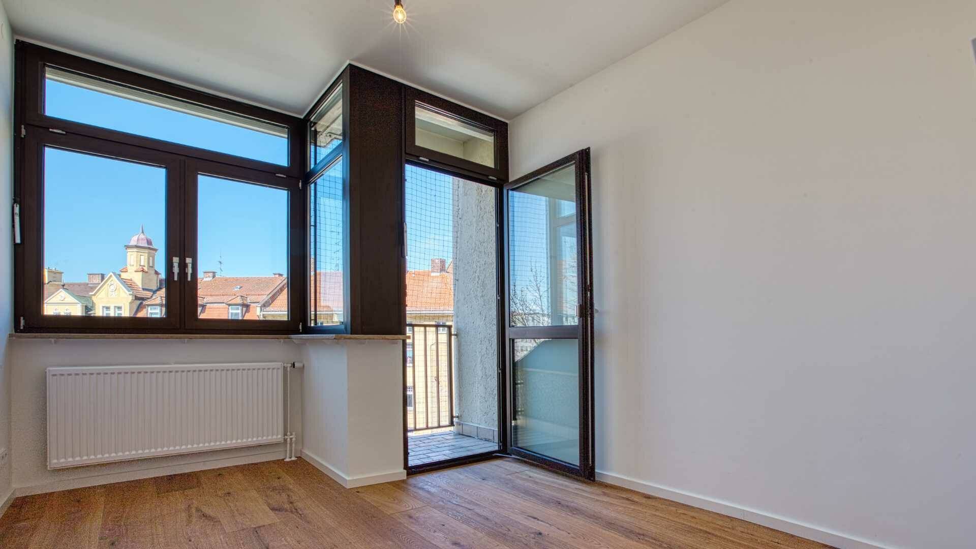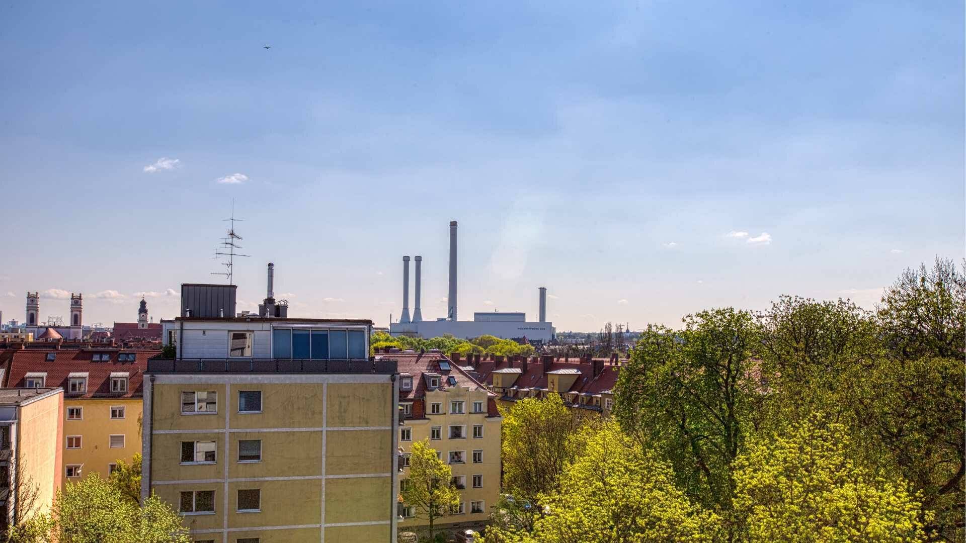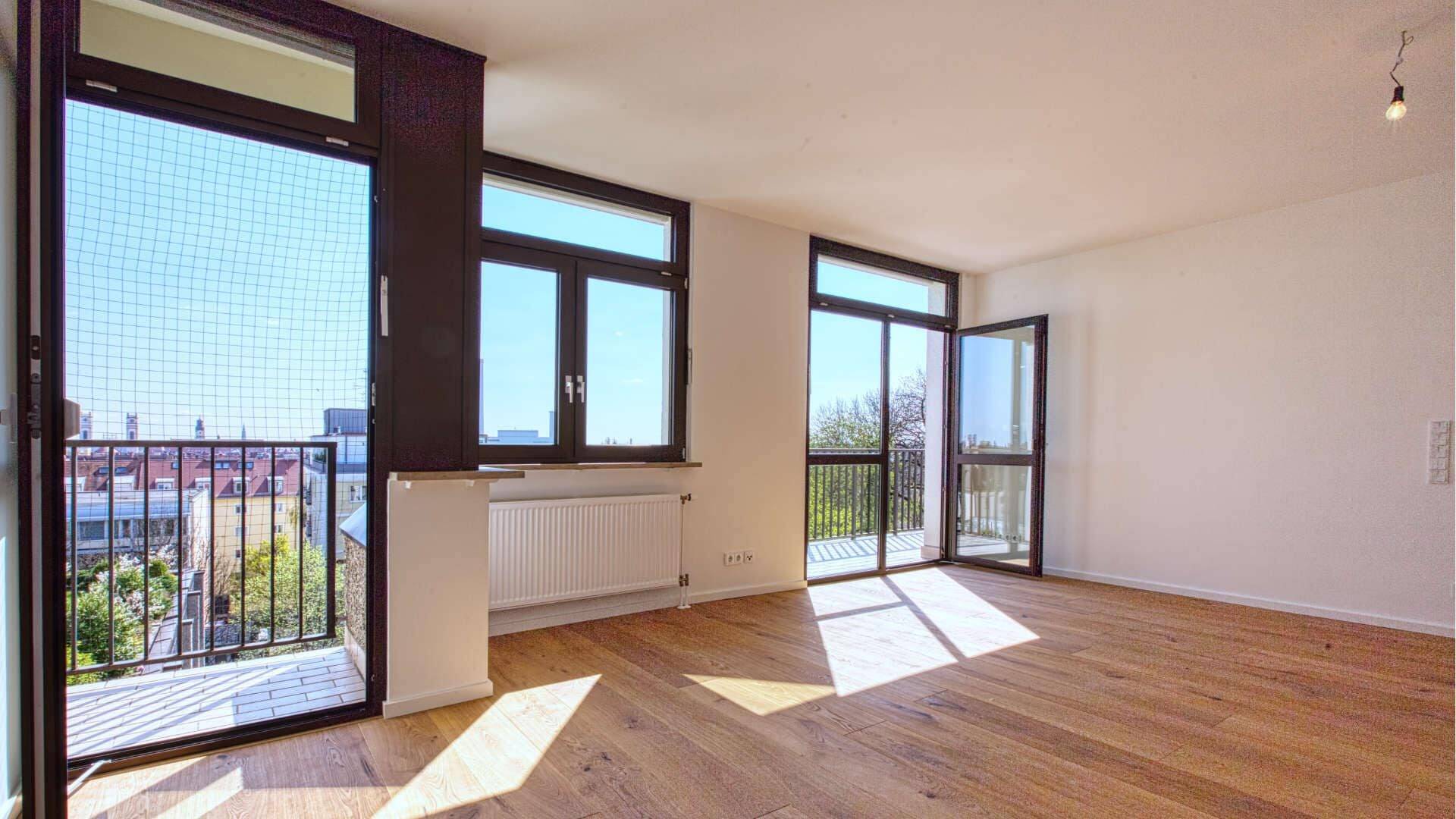 Beim Betreten der Wohnung fällt zuerst auf, dass alles sehr hell ist. Das liegt vorwiegend an den vielen bodentiefen Fenstern, die Sie in allen Zimmern haben. Der Grundriss ist mit Sinn für Detail durchdacht und überzeugt durch Vielseitigkeit. Die Räume sind optimal ausgestattet und haben einen unaufdringlichen, charmanten Stil. Mit insgesamt ca. 97 m² Wohnfläche haben Sie sehr gute Gestaltungsmöglichkeiten. Der großzügige Balkon mit dem tollen Blick auf München – Sie sehen sogar die Frauenkirche – sorgt für einen wunderbaren Flair.