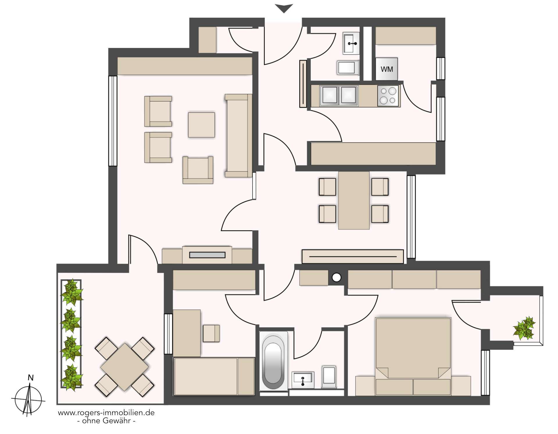 Zur Wohnung gehören außerdem ein Abstellraum sowie ein separates Gäste-WC. Die Westloggia lädt mit ausreichend Raum für Gartenmöbel zum Entspannen ein.