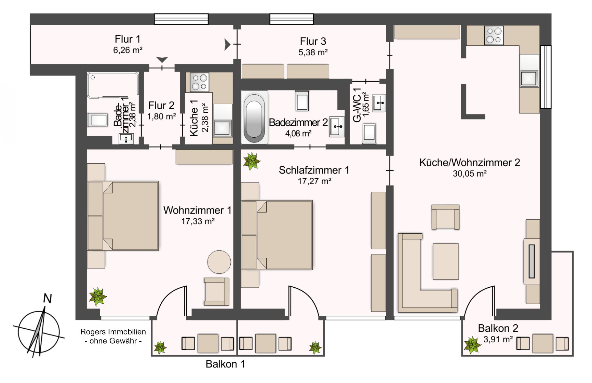 Mit einer Wohnfläche von 95,4 m² (Nutzfläche von ca. 99,5 m²) bietet die Wohnung ein offenes, großzügiges Raumgefühl, das sowohl Familien als auch Paaren oder anspruchsvollen Singles ein komfortables Zuhause ermöglicht. Der Mittelpunkt des Wohnens ist der weitläufige Wohn- und Essbereich mit offener Küche, der fließend auf die einladende Loggia übergeht. Hier genießen Sie Ihren Morgenkaffee mit Blick ins Grüne oder lassen den Tag entspannt unter freiem Himmel ausklingen – der schöne Holzbelag der Loggia schafft dabei ein besonderes Wohlfühlambiente. Die Loggia ist sowohl vom Wohnzimmer als auch von der Küche aus zugänglich und erweitert den Wohnraum ins Freie.