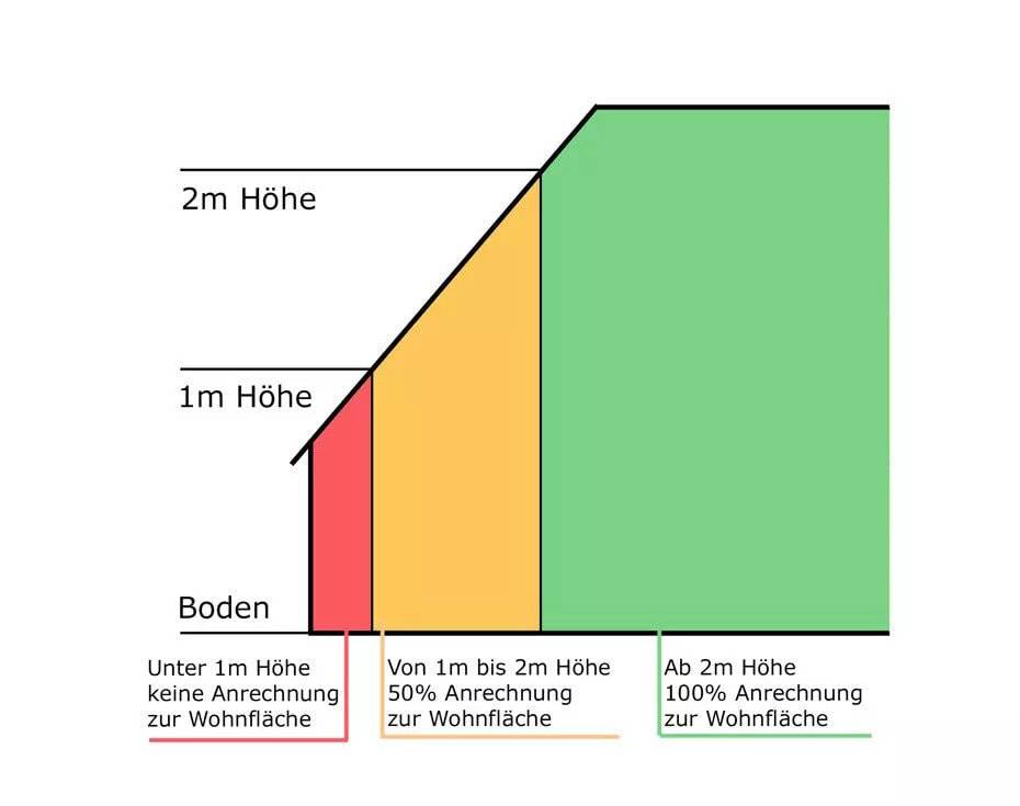 Für die Berechnung der Wohnfläche spielt hauptsächlich die Raumhöhe eine entscheidende Rolle. Bei Dachgeschosswohnungen dürfen Flächen unter Dachschrägen bis zu einem Meter Raumhöhe zur Wohnfläche gar nicht angerechnet werden. Fläche unterhalb einer Schräge von einem Meter bis zu zwei Metern können nur zur Hälfte gerechnet werden. Das Gleiche gilt für Räume, die wenige als zwei Meter hoch sind, wie zum Beispiel Dachkammern. Räume und Raumteile, die eine Höhe von mindestens zwei Meter und mehr ausweisen, werden zur Wohnfläche voll angerechnet werden. Wenn sich innerhalb der Wohnung Treppen befinden, werden Flächen unterhalb von Treppen nach dem gleichen Prinzip berechnet, wie bei Schrägen.